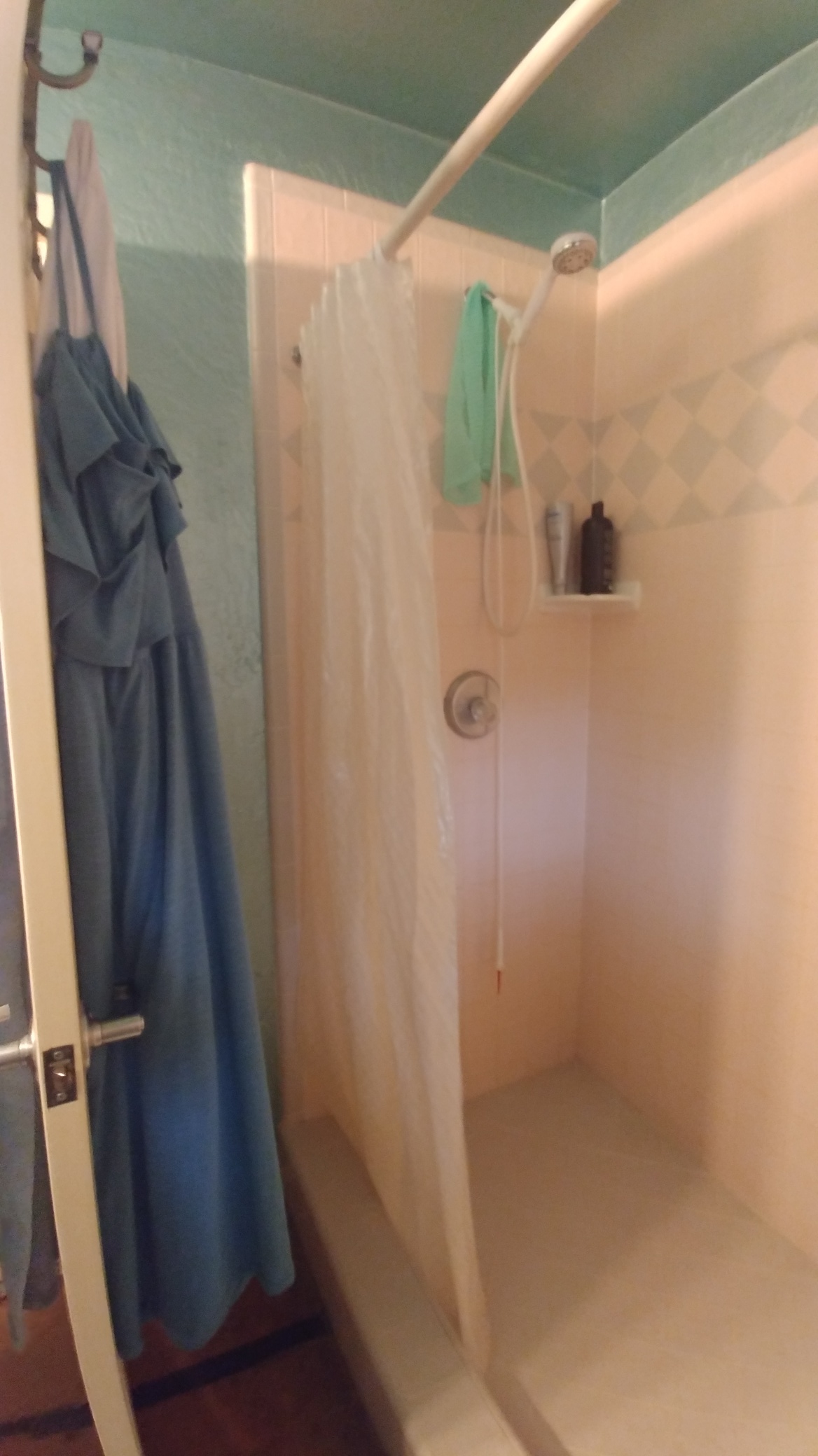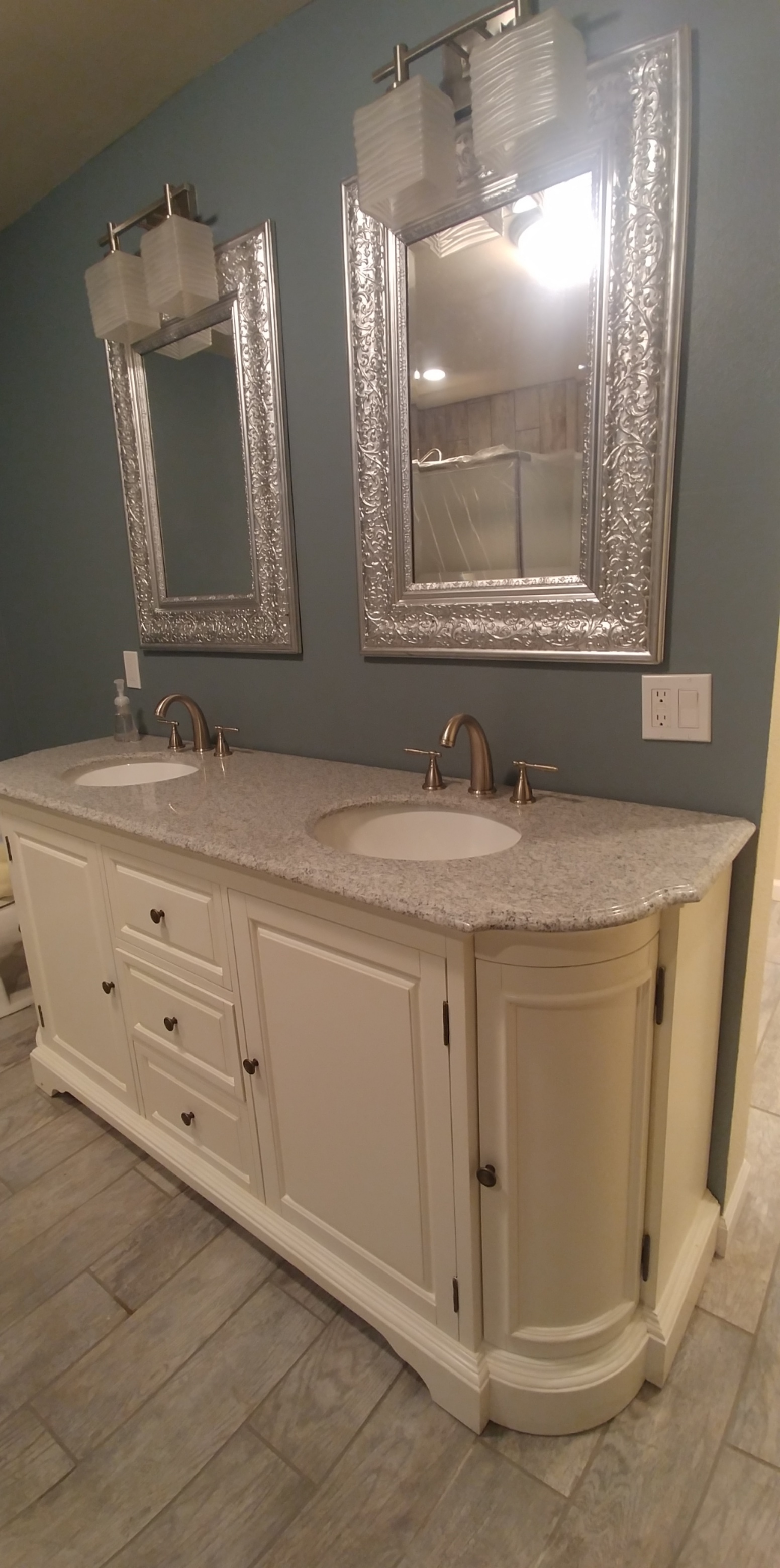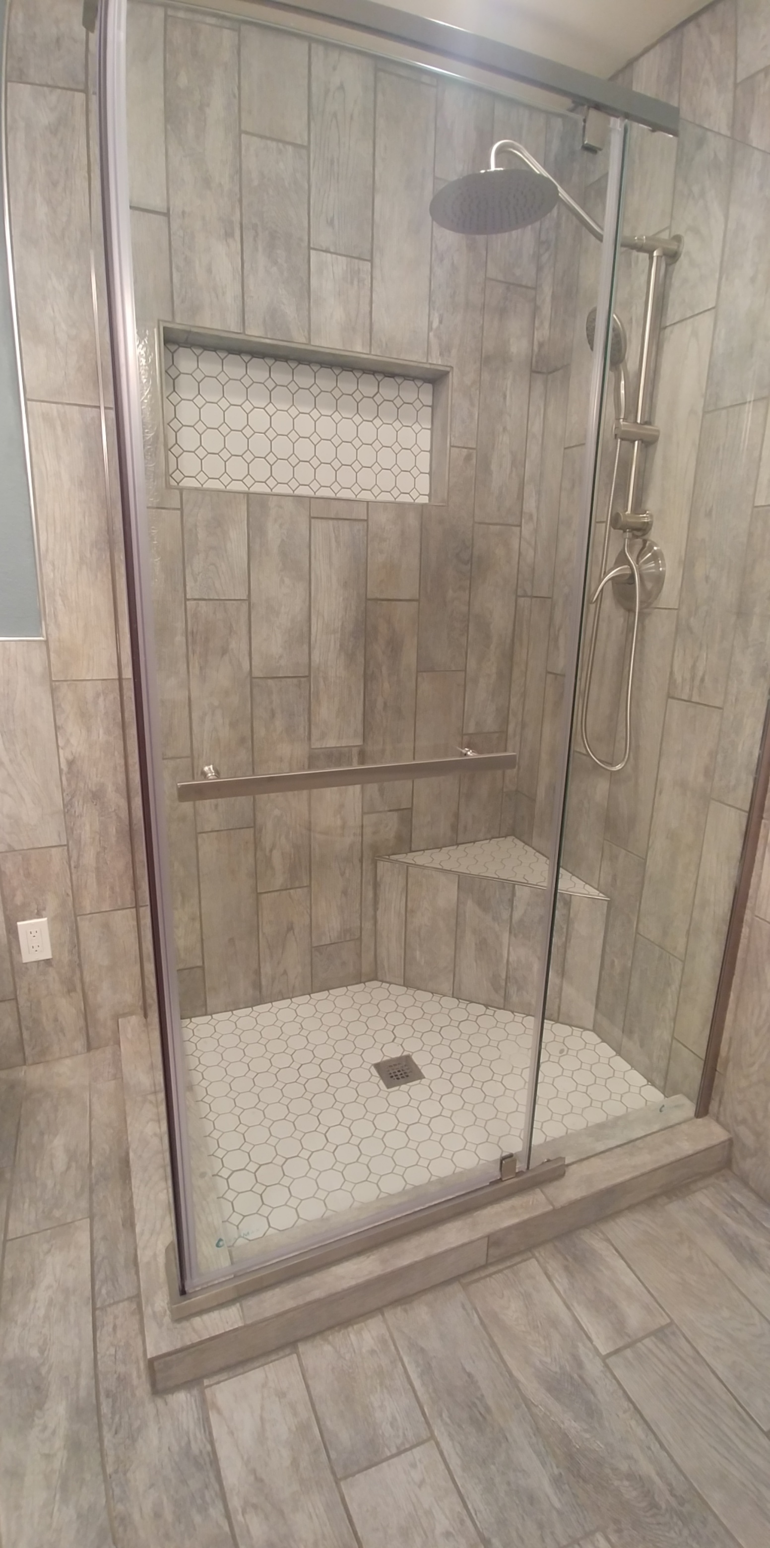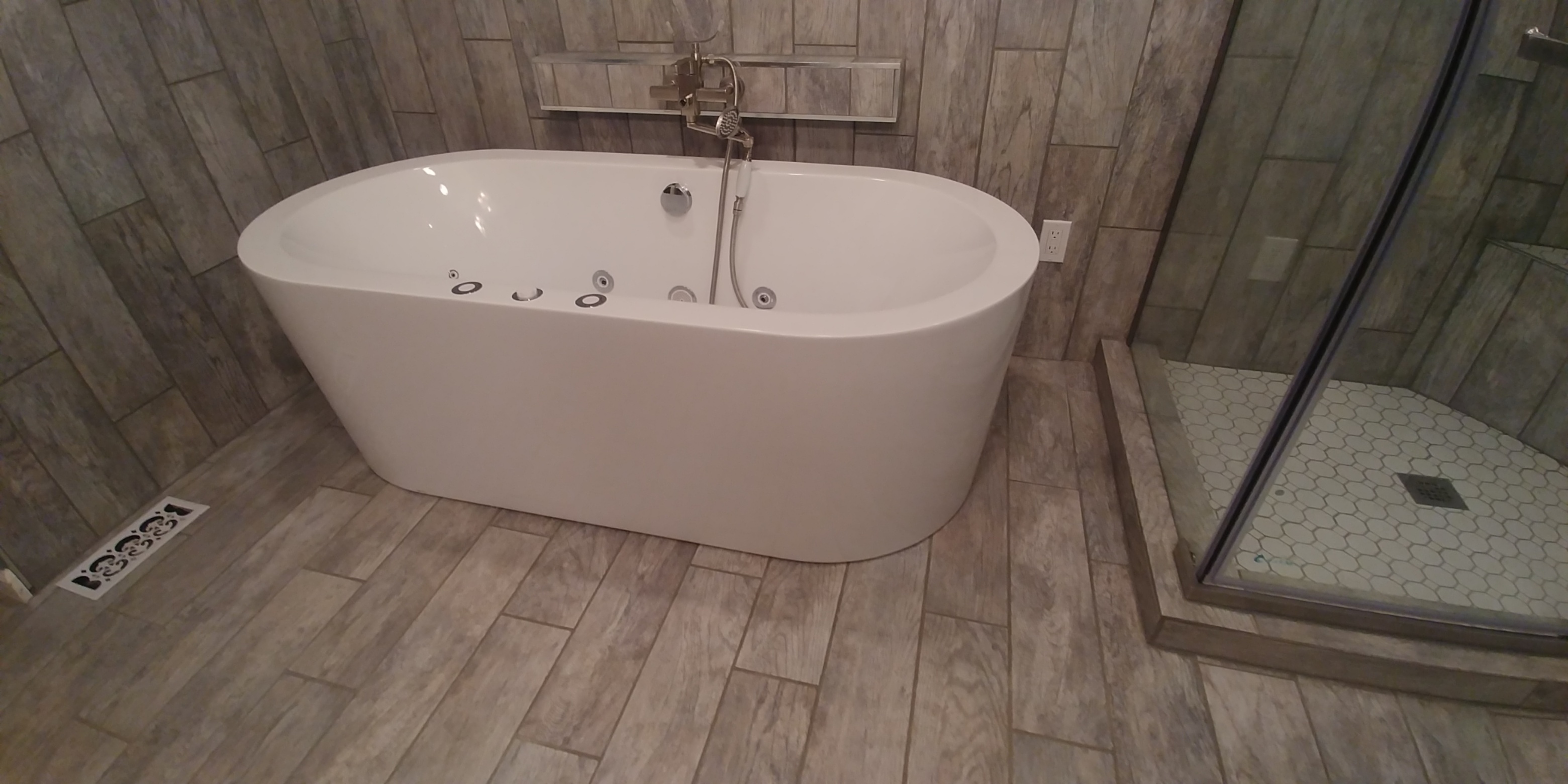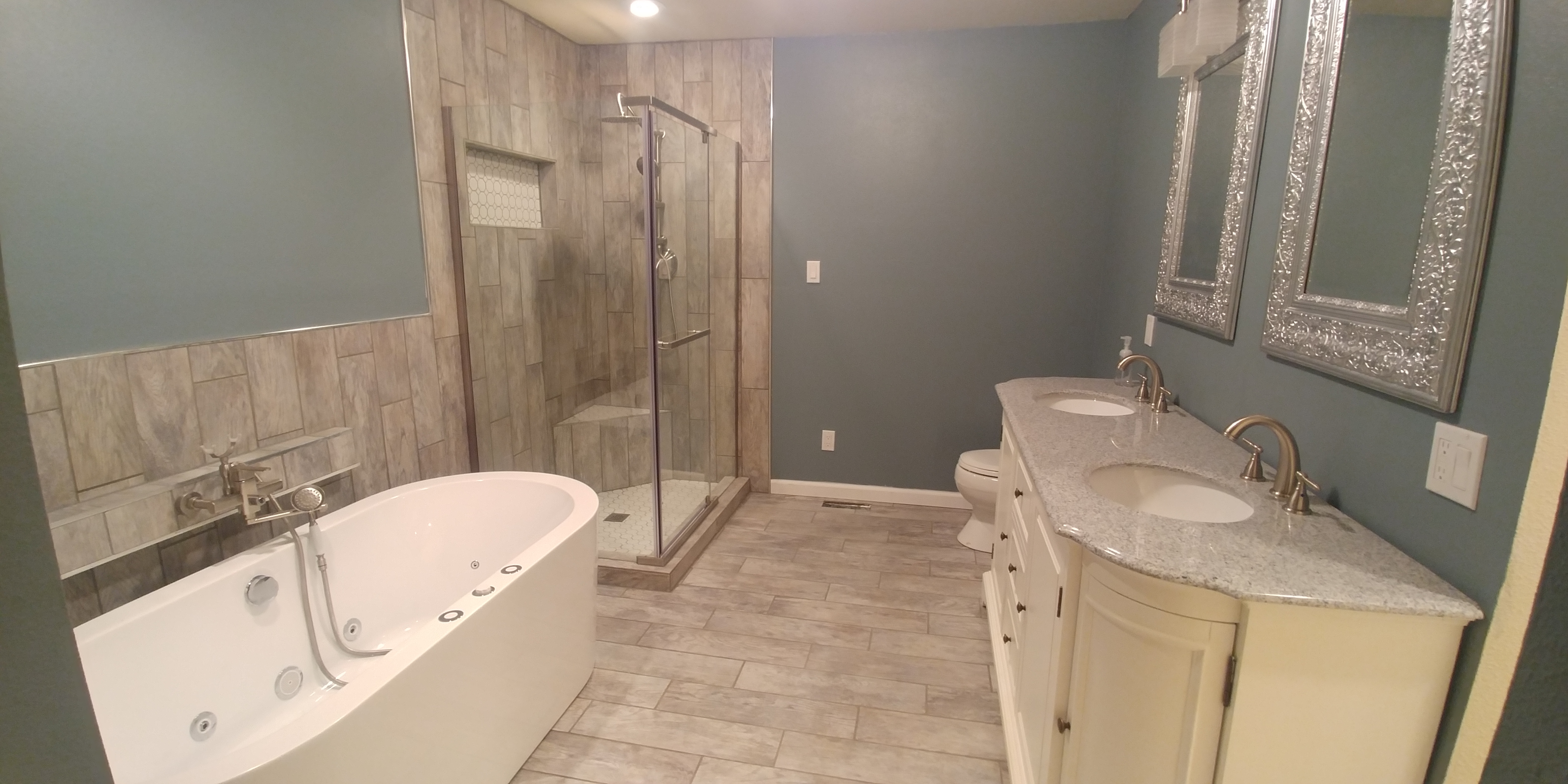We just completed a master bath remodel this week that as part of a larger remodel. The original master bath was smaller, and had an exterior door on one side. It only had enough room for a tub with a shower. We expanded the footprint, filled in the door, added a transom window. The homeowner chose a wood look tile, which we installed throughout the remodel, and used in the new shower and around a new spa tub. We installed a new double vanity, new lighting above it, and can lights in the ceiling.