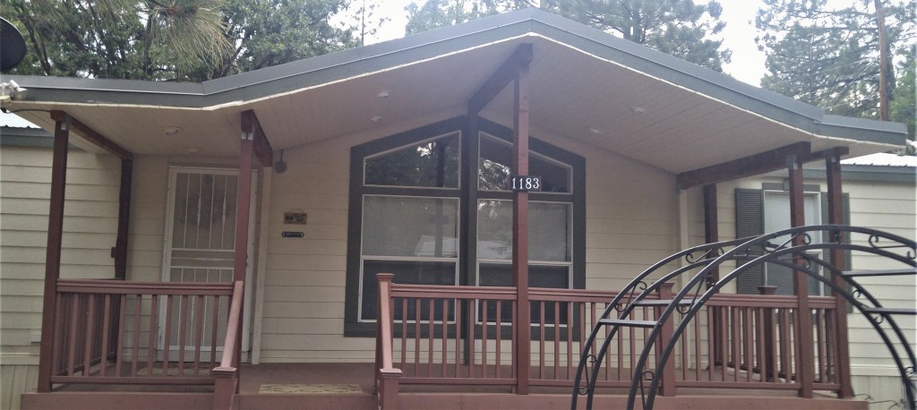 Medium-large porch on the side of house. Composite decking, metal roofing, wood picket railing and skirting matching siding with door access. One set of stairs.