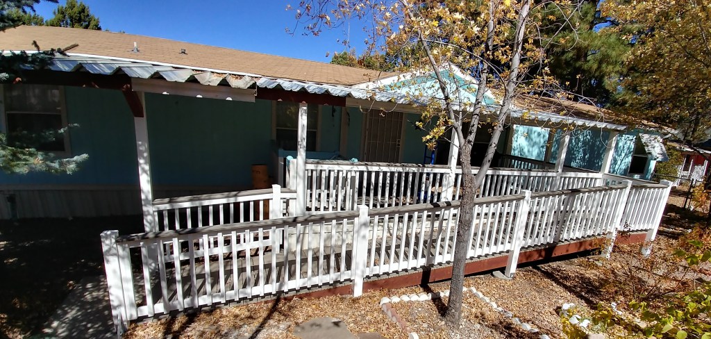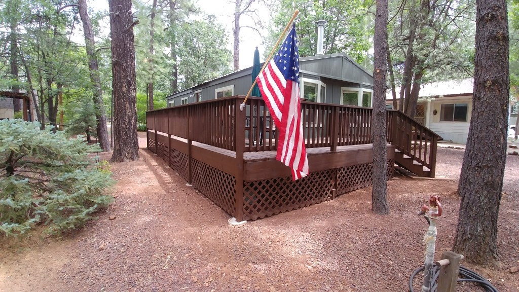 Large deck on the corner of a house with wood picket railing & lattice skirting