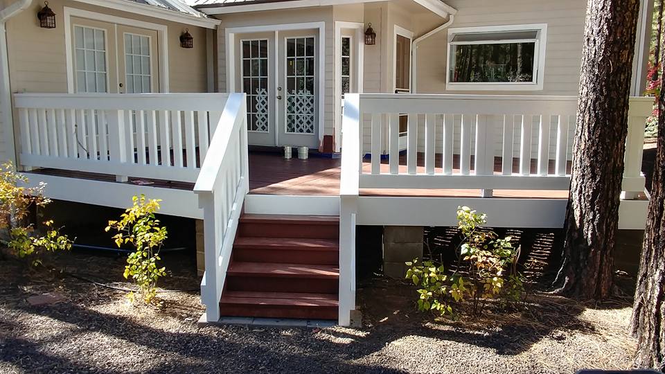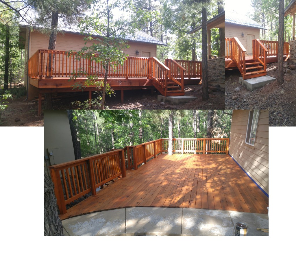 Deck refinishing project. We replaced some rotted treads and support structure on this large redwood deck. Then refinished treads and railing in solid stain and Added vinyl lattice skirting. Repaired gates and stiffened the railing up to get rid of the wobble. Refinished stairs on opposite side of house.
