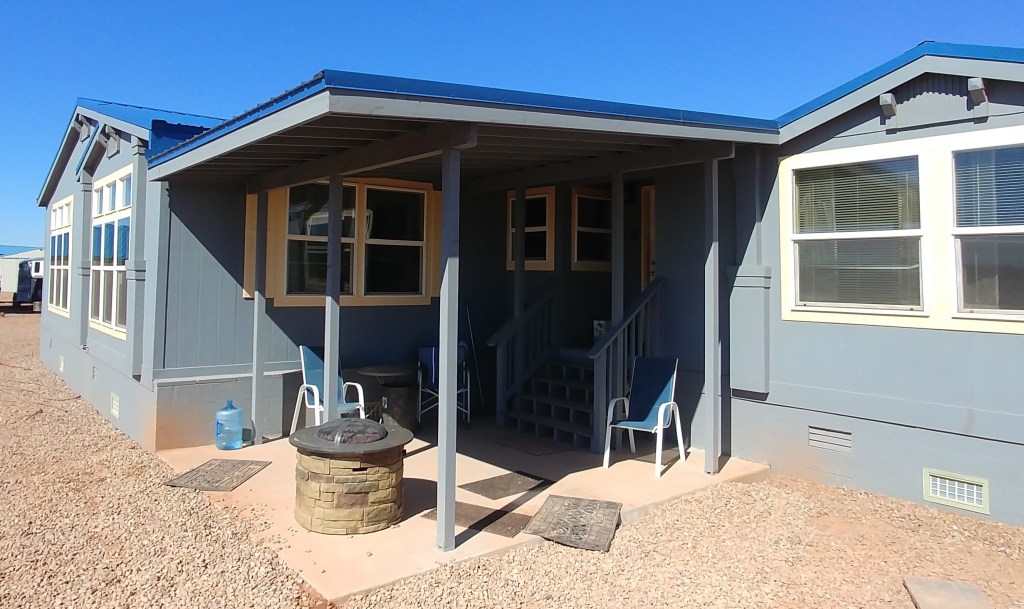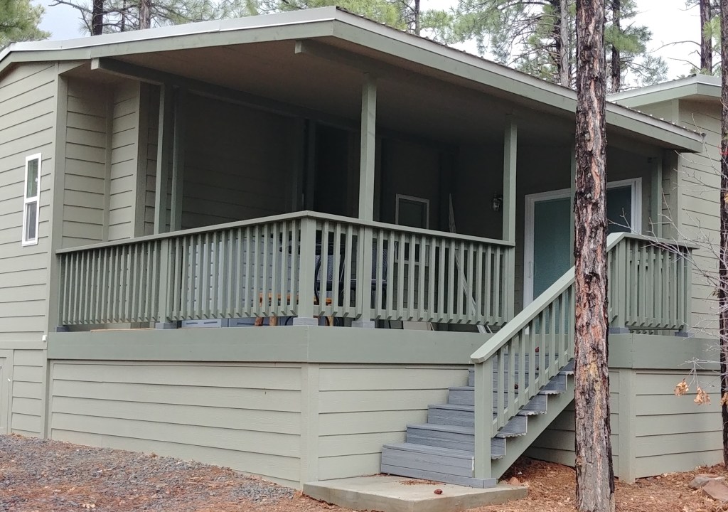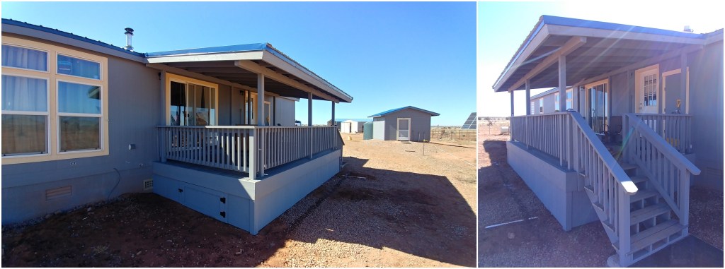 Medium-sized back porch with metal roof, composite treads, painted soffit, wood picket railing, and matching skirting. One landing and set of stairs. We also completed a living room addition for this project.