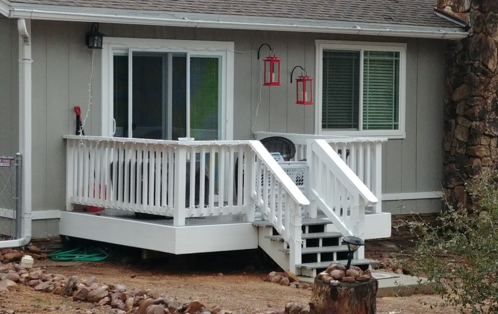For this client we created an entry off of their bedroom by replacing a window with this sliding door and built them a small deck. This deck has composite treads, wood picket railing and one set of stairs.