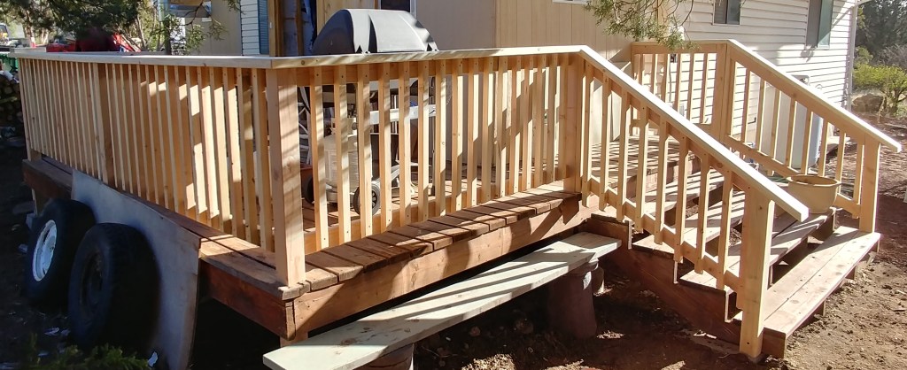Added a new landing and a long set of stairs to the back yard. Removed old railing, and added new wood picket handrails. Sanded but left unstained for customer to finish.